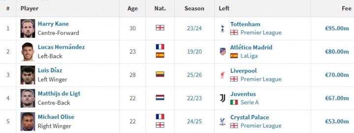 德国转会市场网站显示,拜仁队史引援纪录目前由凯恩保有,拜仁在两年前以9500万欧的价格将其引进。